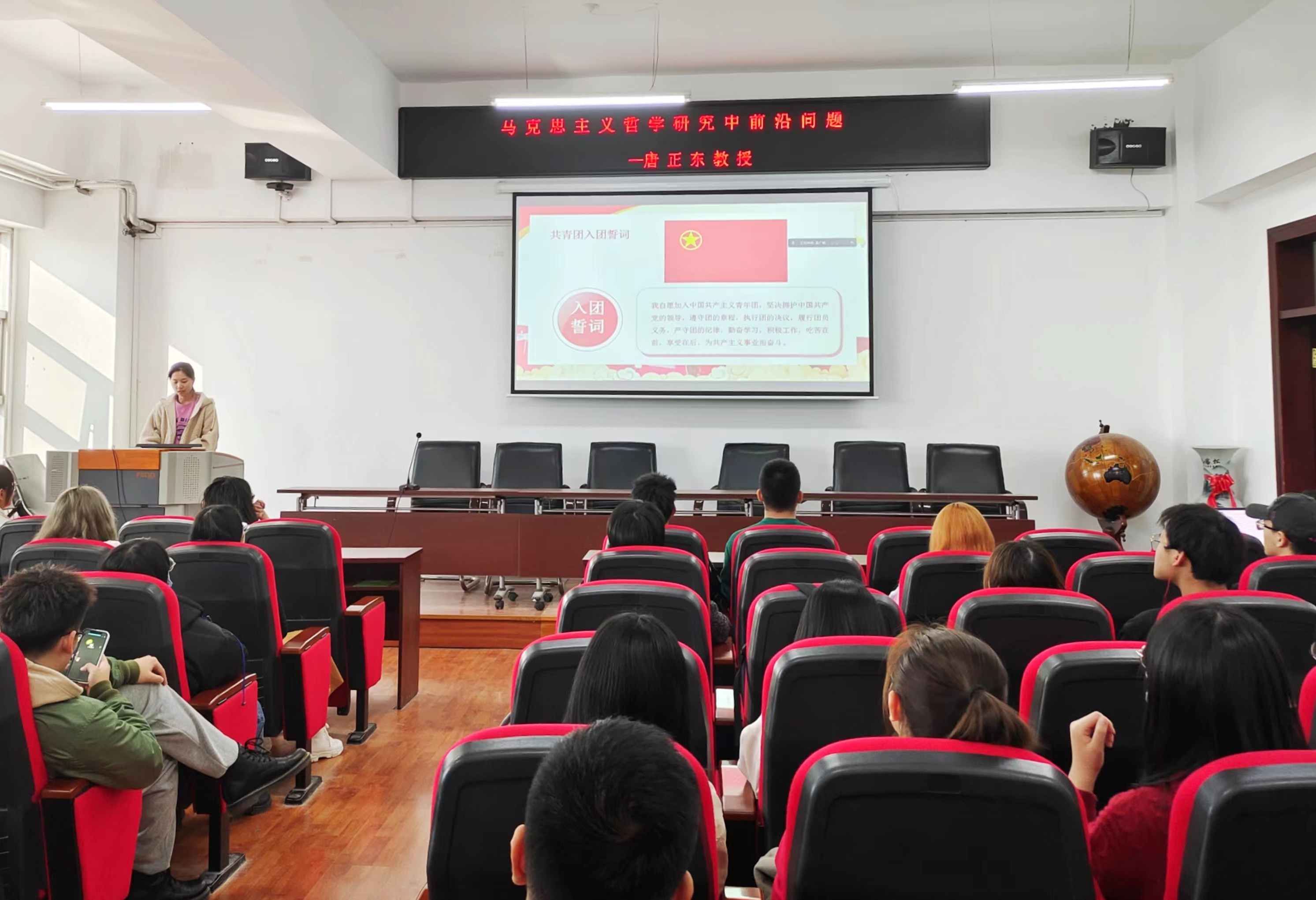 仪式的最后一部分为共唱团歌,哲学二班的团员同学一起唱团歌,在同学嘹亮的歌声中展现出新一代青年的风采,相信同学们定会惜时、自强、养德,肩负起历史使命。从现在做起,遵守团的章程,以团员的标准严格要求自己,为实现伟大复兴中国梦不懈奋斗。