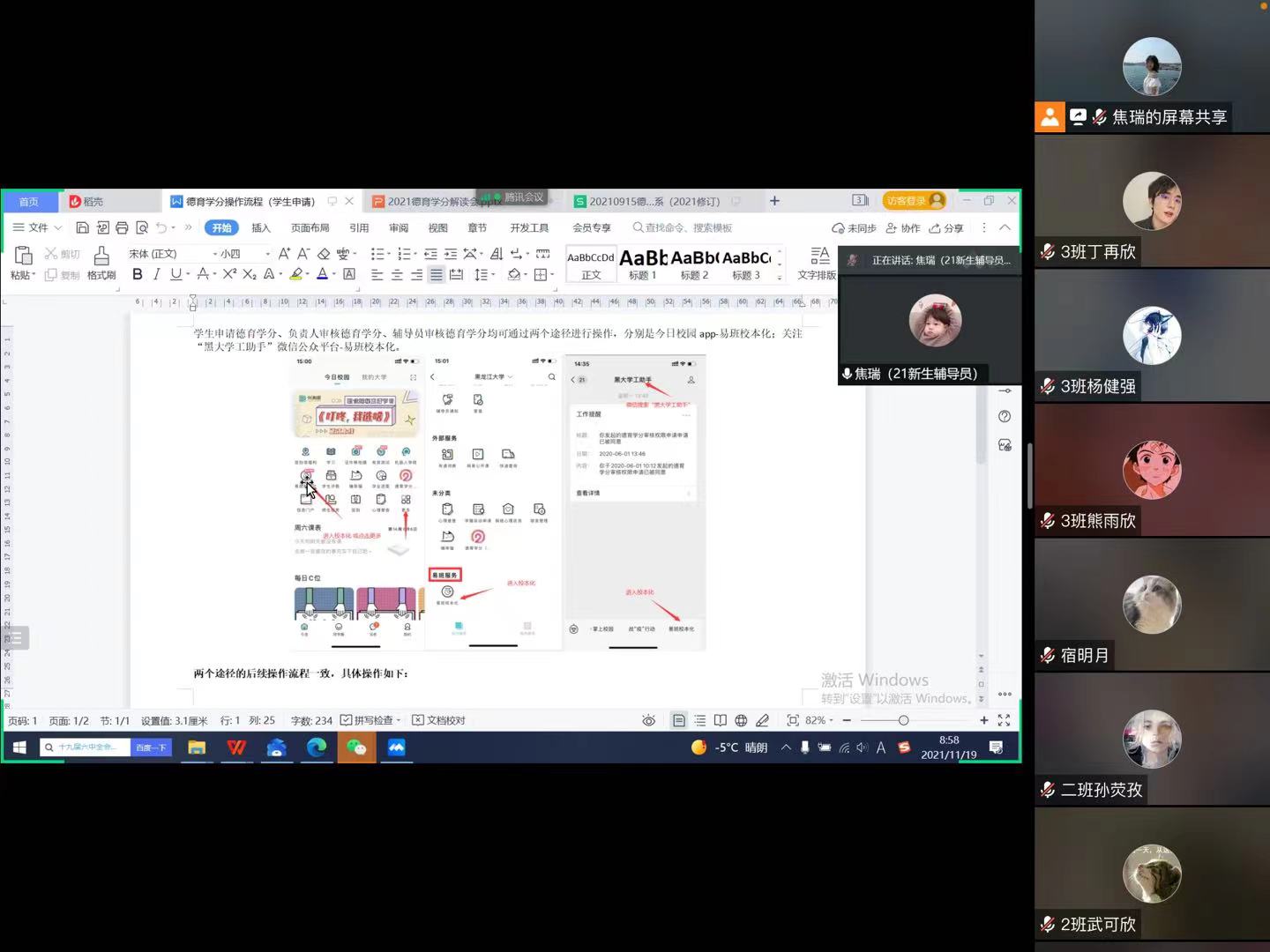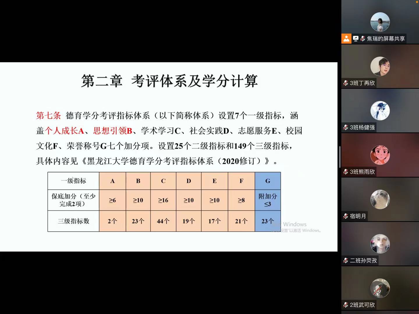 随后,焦老师向同学们讲解了德育学分加减分指标体系,并罗列出自开学以来21级新生参加的德育活动,供同学们申请德育学分。此外,焦老师向同学们介绍了德育学分的申请流程,以便于新生申请德育学分的操作。
