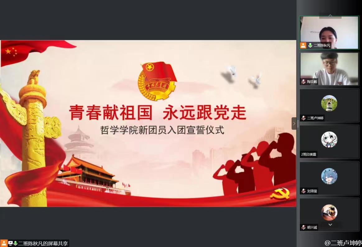 于2022年6月9日下午线上召开新团员入团仪式。本次仪式由21级哲学二班团支书陈秋凡主持,51视频
