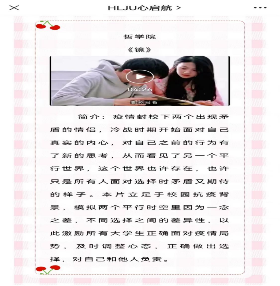 影动心声,“疫”路同行。为加强疫情期间心理健康教育知识的宣传和普及,全面提高同学们战胜疫情的信心决心,培养学生疫情期间理性平和、乐观向上的积极心理品质,积极响应校学生工作部心理健康教育中心的号召,征集“万众一心,共战‘疫’情”心理微电影(微视频)作品,同学们用微电影传递青春正能量,展现新时代青年大学生的责任与担当,51视频