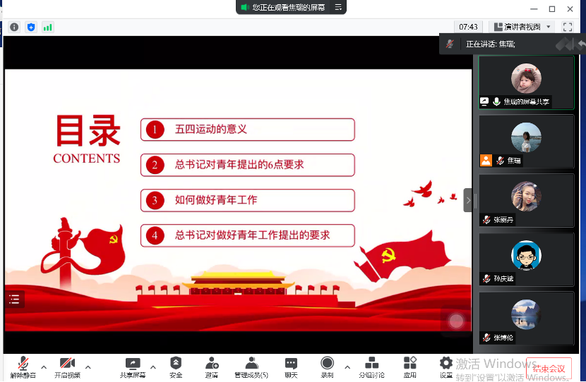学生工作队伍以能力作风建设为契机,于6月29日集中学习了《习近平在纪念五四运动100周年大会上的讲话》,学史明理,学史崇德,学史增信,学习五四精神,弘扬光荣传统,赓续红色血脉,提高能力作风。51视频