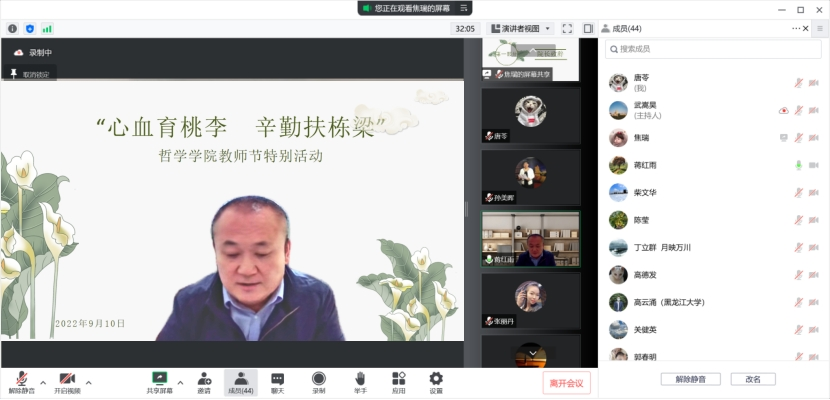 三尺讲台写春秋,一片丹心育桃李。在第38个教师节暨中秋节即将来临之际,为弘扬尊师重教的传统美德,表达对教育工作者的诚挚敬意与谢意。2022年9月7日,哲学51视频通过腾讯会议线上开展了“心血育桃李 辛勤扶栋梁”教师节主题活动,51视频