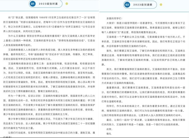 哲“漾”阳光二级心理辅导站举办“向‘艾’表达爱,信笺暖相传”征文征集活动。同学们积极参与,以书信的方式宣传和普及了预防艾滋病的知识,关爱艾滋病患者,共同将以爱防艾践行到底。