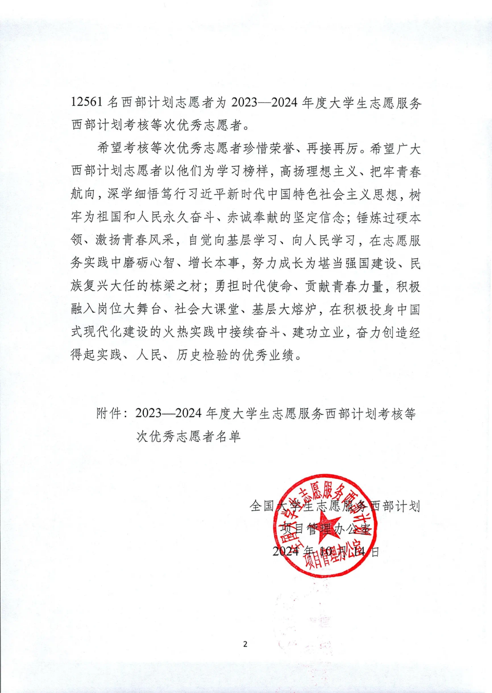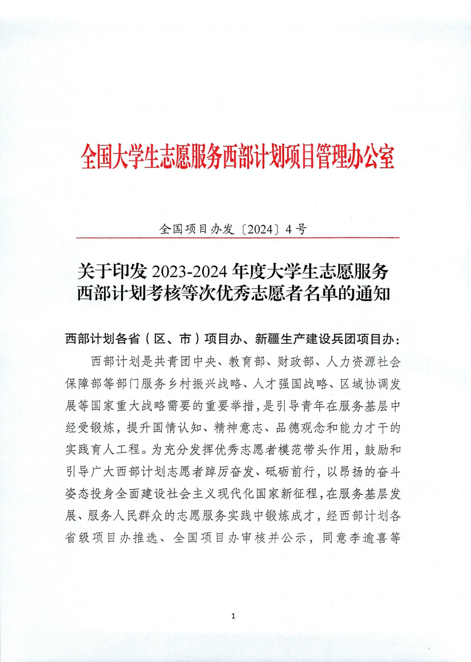 近日,全国大学生志愿服务西部计划项目管理办公室下发《关于印发2023—2024年度大学生志愿服务西部计划考核等次优秀志愿者名单的通知》,我院23届本科毕业生、24级研究生李亚男荣获2023-2024年度全国大学生志愿服务西部计划考核等次优秀志愿者。