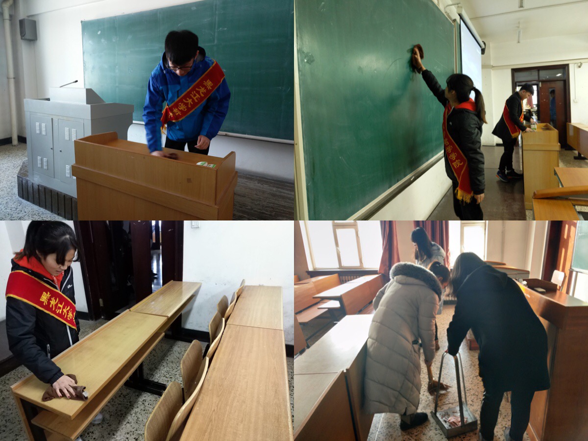 青协志愿者们在同学们上课之前分别来到汇文楼427、477、555等多个教室进行了志愿清扫活动。