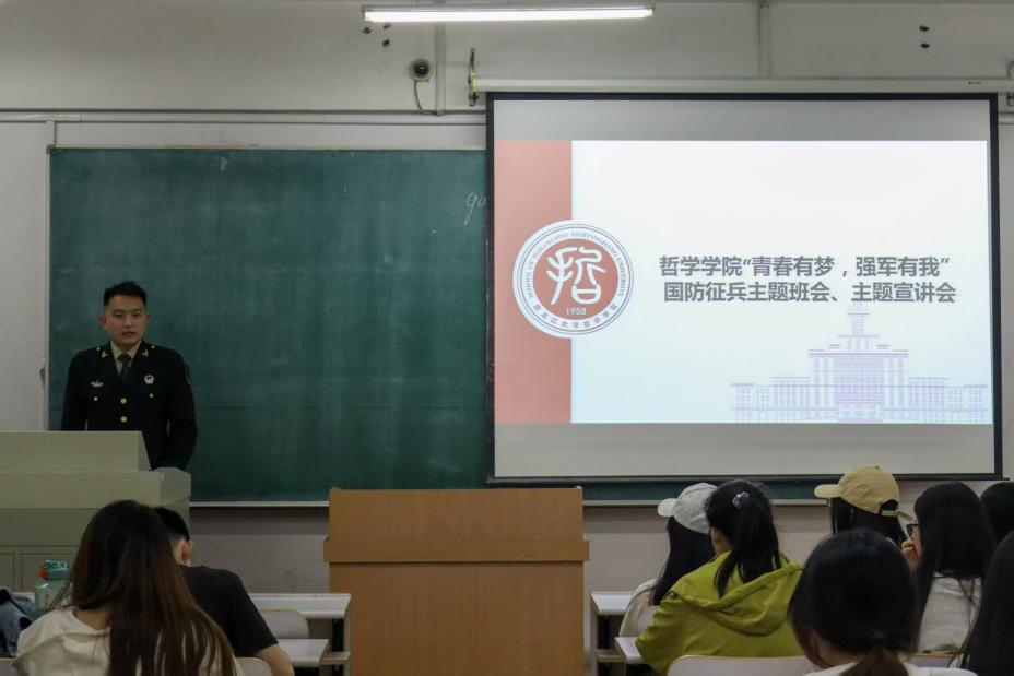 唐旭同学生动地讲述了自己在部队的军旅生活,讲述了自己在部队淬炼成长的难忘故事,展现了新时代大学生士兵的英姿与风采。同时,他也为同学们普及了征兵时间和应征条件、征兵相关待遇等,让同学们征兵政策有了进一步了解。唐旭特别提到,"当兵不仅是一份荣耀,更是一次锻炼自己的机会。"在答疑环节,他还就同学们关心的近视矫正手术、体能训练等问题进行专业解答,现场气氛热烈。不少同学表示,通过这次讲解,对参军入伍的政策有了更清晰的认识。