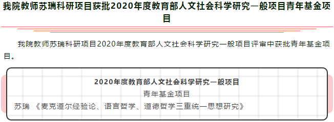 “哲”里喜讯|我院教师苏瑞科研项目获批2020年度教育部人文社会科学研究一般项目青年基金项目