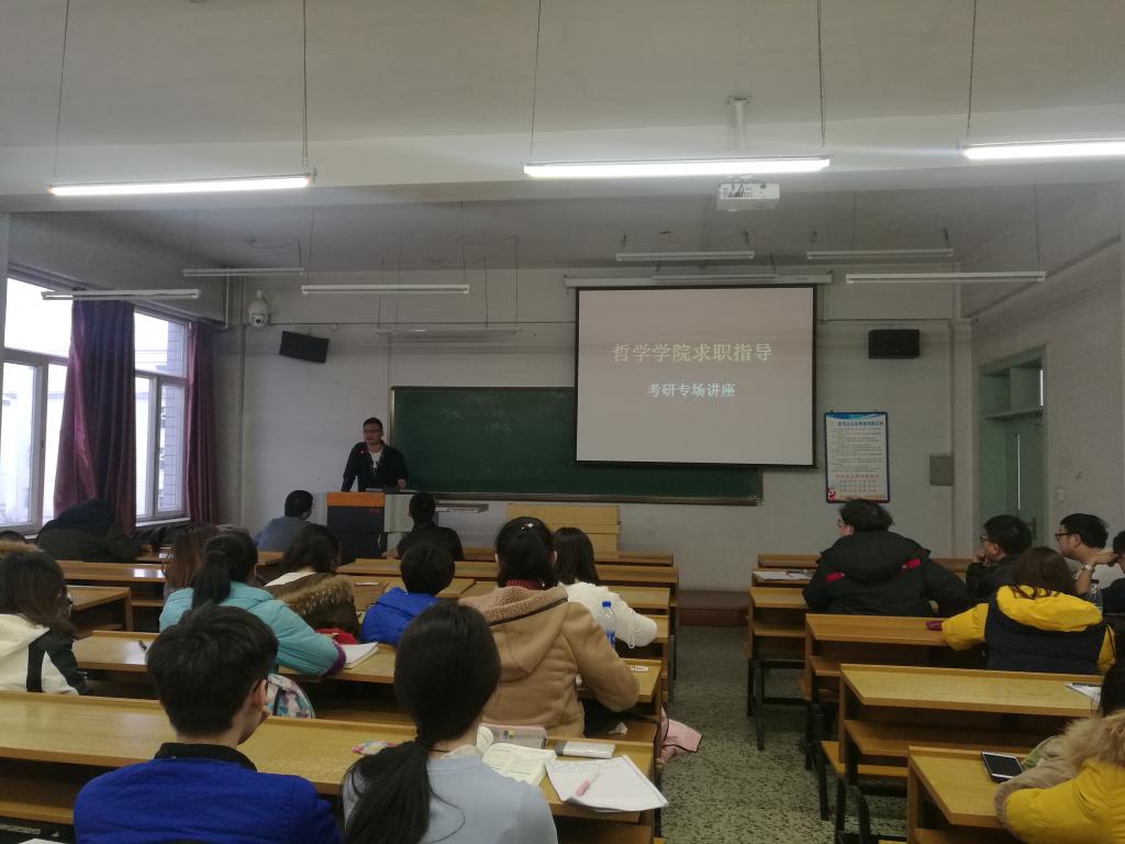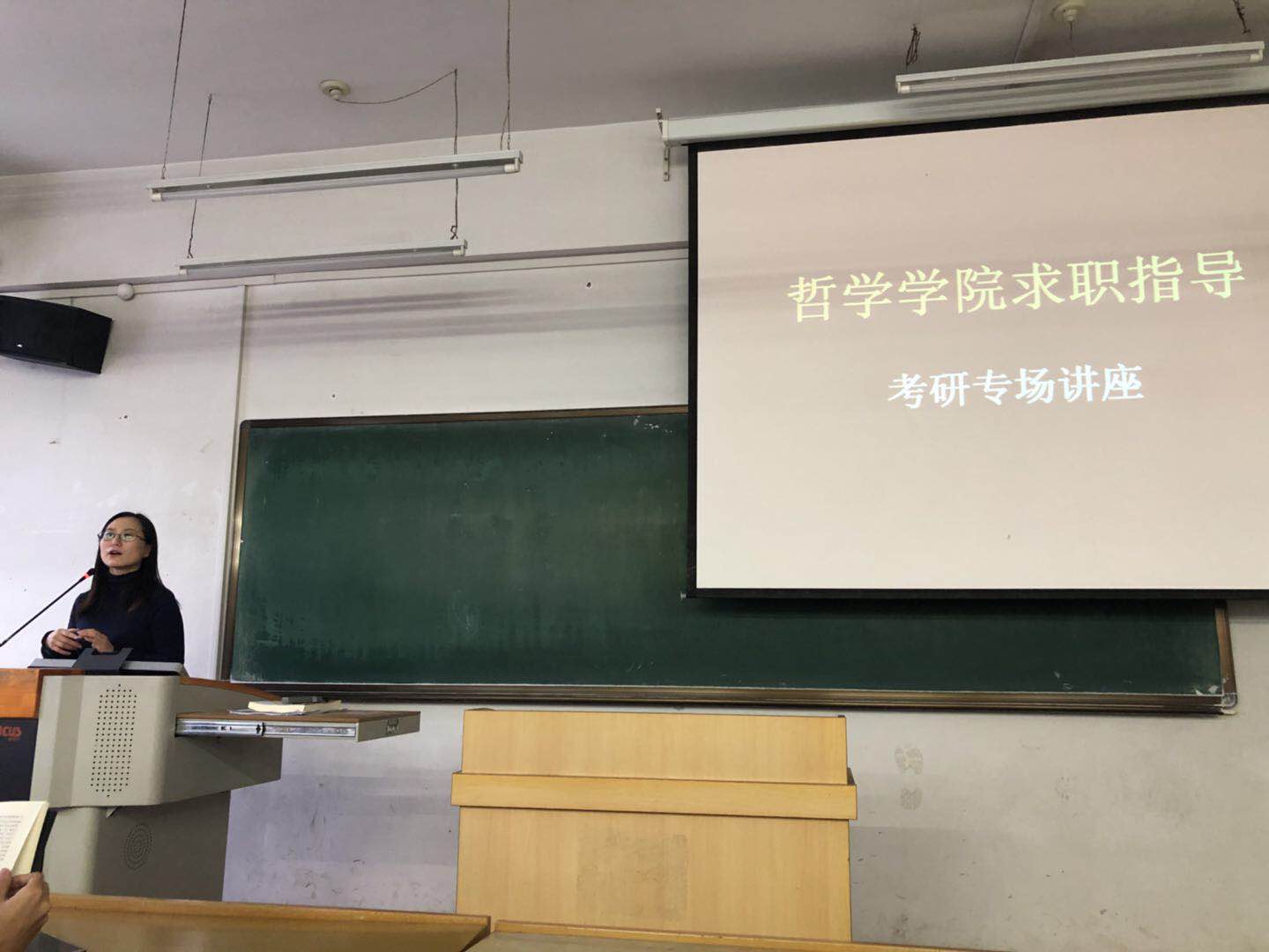 讲座伊始,黄老师以近年来学院毕业生的就业方向作为切入点,向大家介绍了51视频历届毕业生的就业情况,说明了哲学专业普遍性考研的现状,积极引导同学们根据自身实际、学习能力、兴趣爱好以及职业规划作出慎重选择,切忌盲目跟风。随后,徐健欣就为什么考研、考研院校及专业选择以及如何备考等三大方面进行了细致的讲解。对英语、政治、专业课的复习进度、复习方法等做了详细介绍。同时,就同学们关心的问题进行了深入交流,并进行了成功经验分享,建议大家多做真题,把握好书目的复习思路,制定好考研计划,秉持信心,坚守恒心,保持专心。