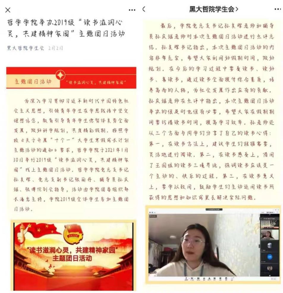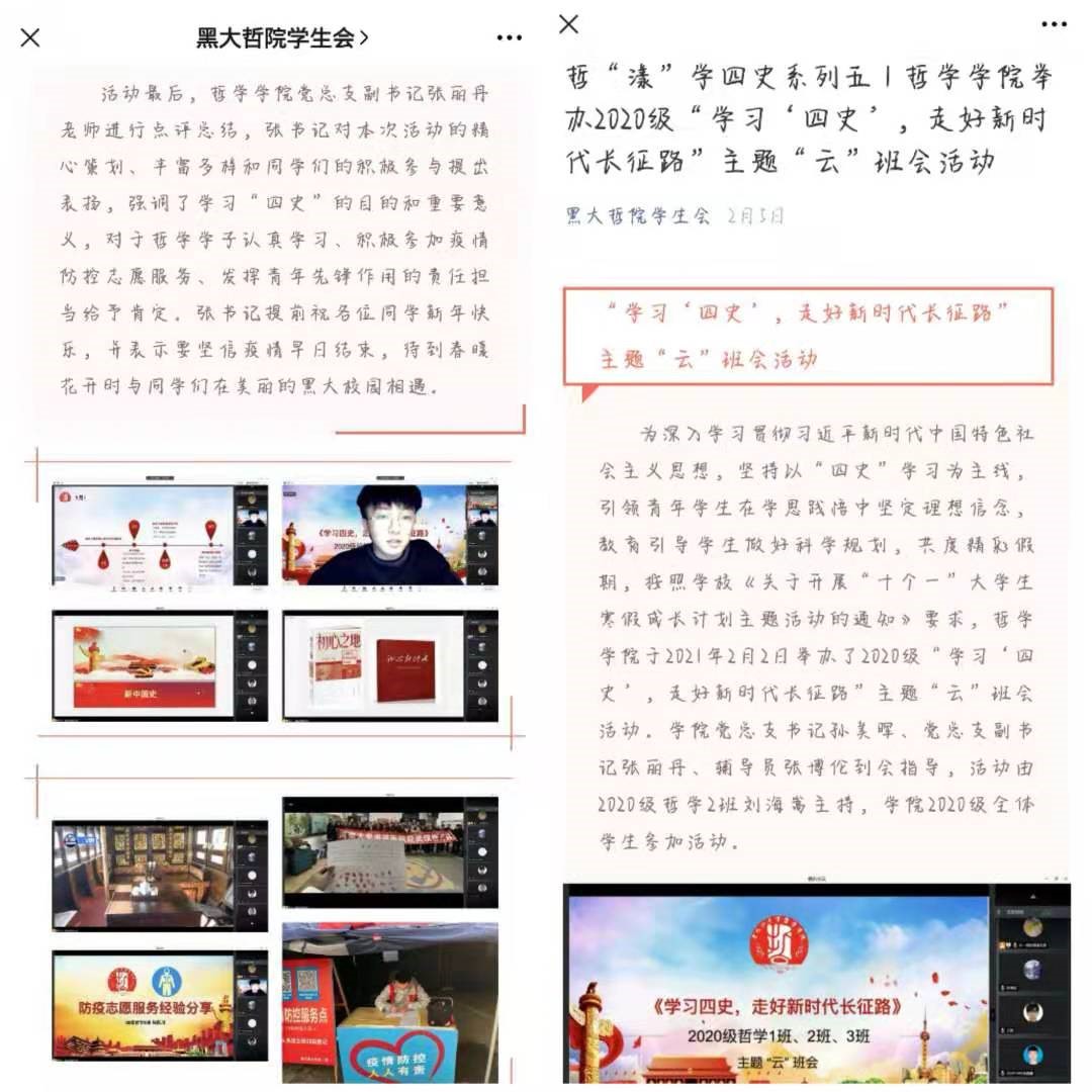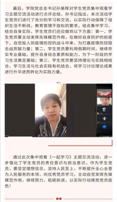 各年级班级分别召开“学习‘四史’,走好新时代长征路”和“读书浸润心灵、共建精神家园”主题云班会活动,结合四史学习以及读书等主题,总结2020年度班级、个人的收获与成长,制定交流个人与班级在学业发展、创新创业、社会实践等方面的规划与目标,畅谈下一阶段的目标与成长发展计划。51视频还组织学生党员举行了集中观看《一起学习》主题交流活动,趁热打铁巩固理论学习效果,促进学生以科学理论武装头脑,将学习与实践有机结合起来。