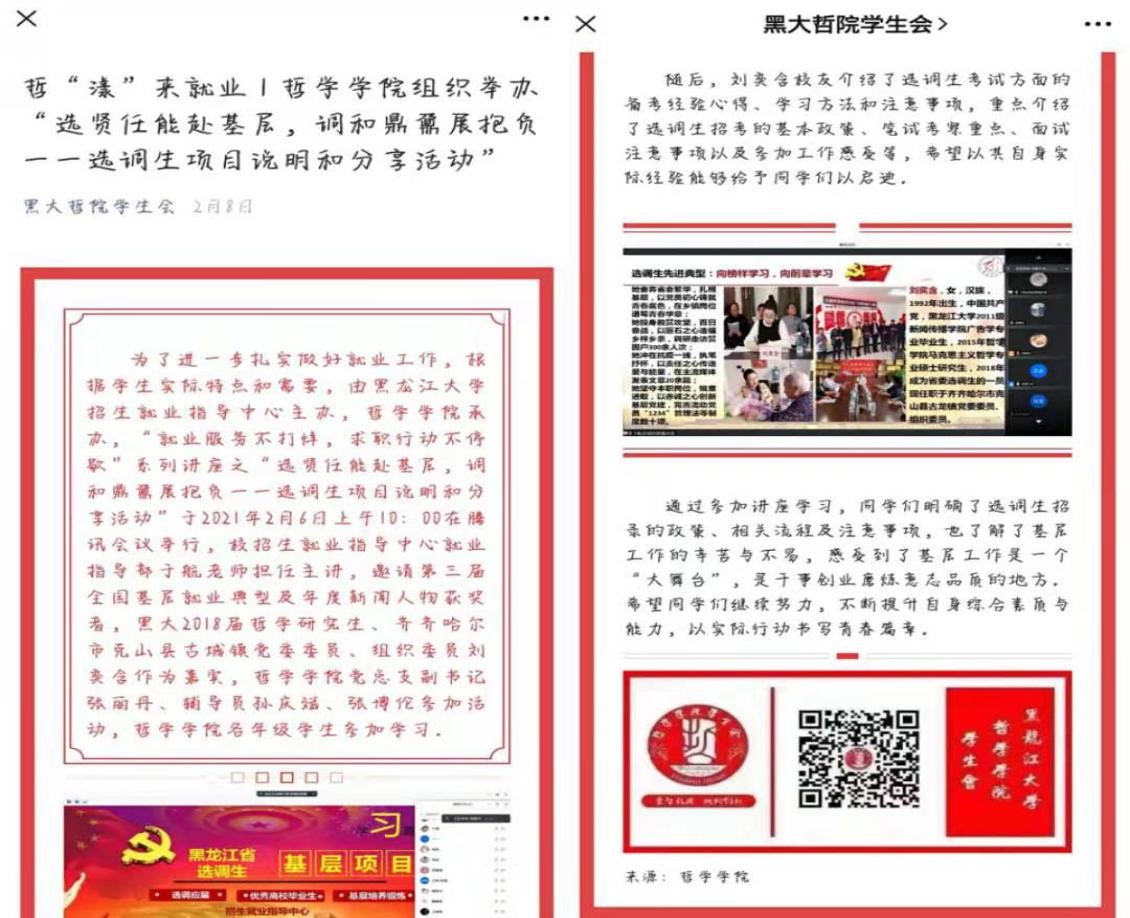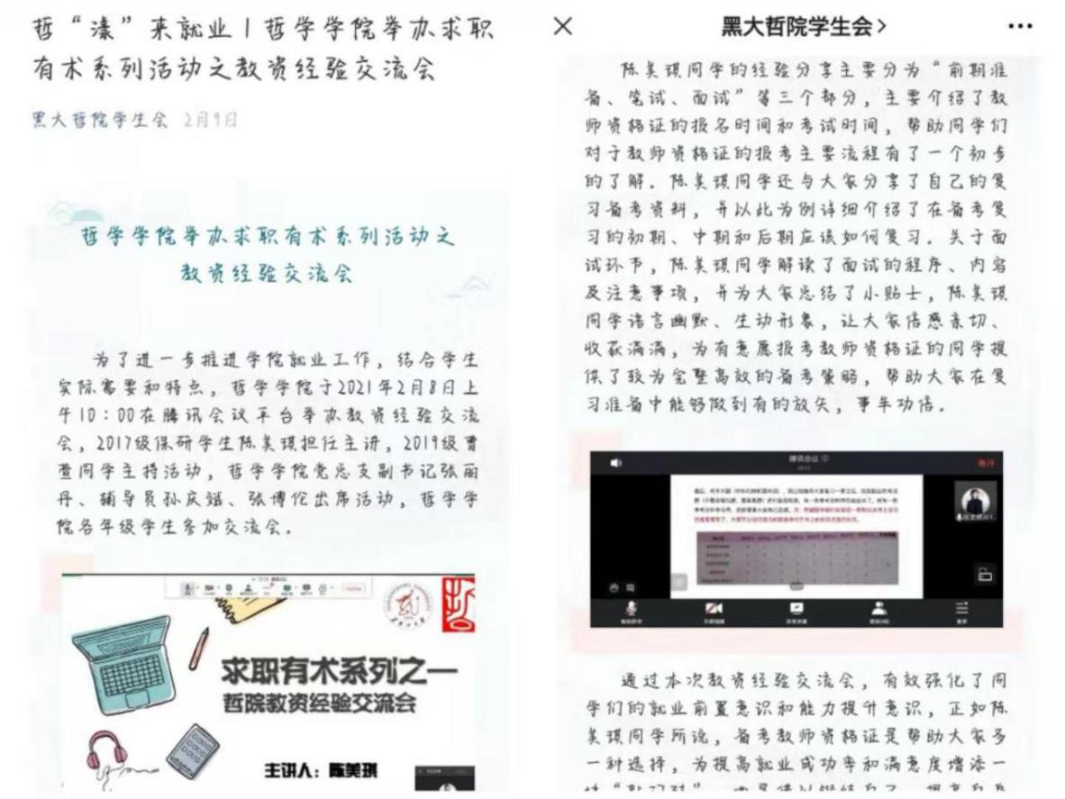 结合就业工作实际,特别邀请社会各界优秀校友,开展“选贤任能赴基层,调和鼎鼐展抱负——选调生项目说明和分享活动”、“‘就业服务不打烊,求职行动不停歇’系列之《90分钟打造HR目不转睛的简历》讲座”、“求职有术系列活动之教资经验交流会”、“基层就业项目介绍”等系列就业交流活动,开启“校友云访谈”,在线上与他们进行一次深入的沟通交流,开展线上访谈行动,并撰写访谈心得体会,听一听“过来人”的建议,聆听暖心的黑大故事,感受黑大人的成长与情怀。
