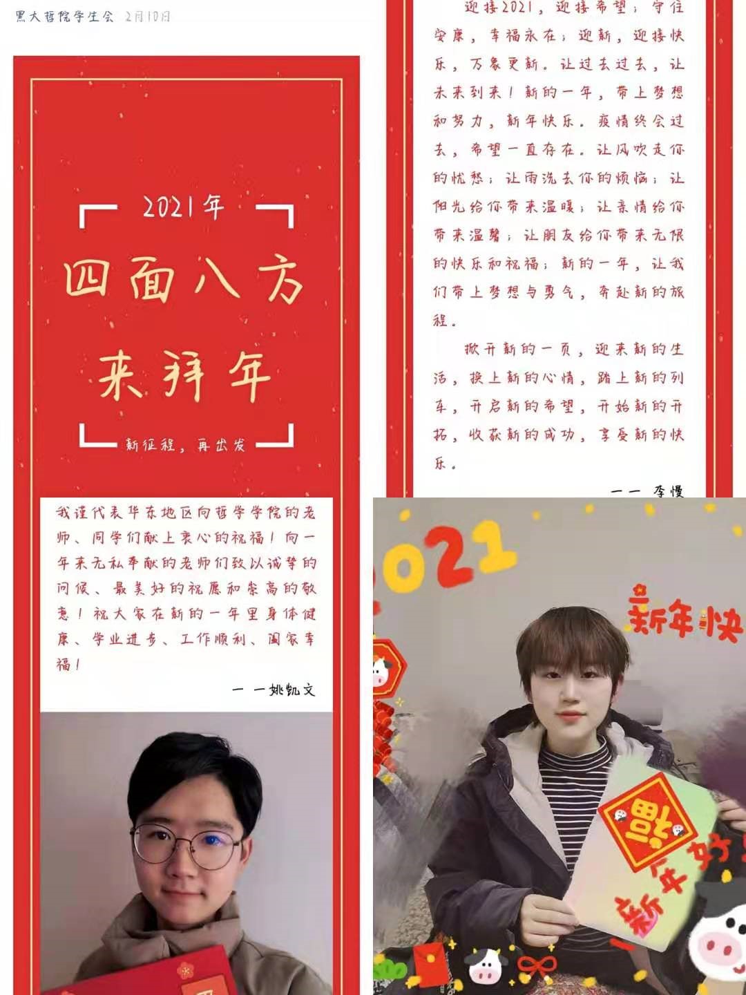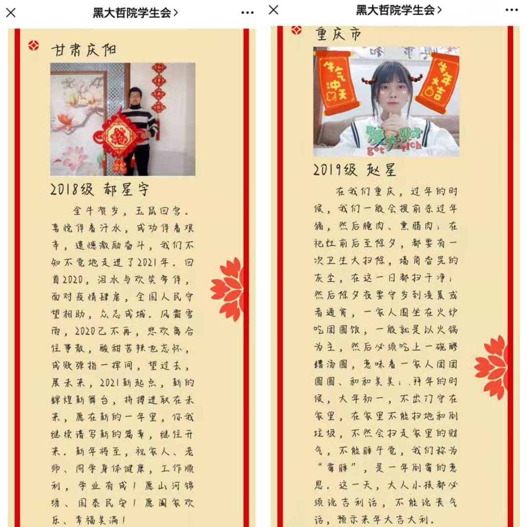 开展“我的家乡我宣传”、“打卡家乡特色美食特辑”、“哲学学子‘四面八方来拜年’特辑”、春联文案及作品征集等主题征集活动,收集展示家乡的生活照、风景照等作品,用发现美的眼睛探寻家乡特色文化,激发学生对祖国河山的热爱,激发学生热爱家乡情怀,以实际行动做家乡文化的传播者和宣传员,为家乡献上新春贺礼。