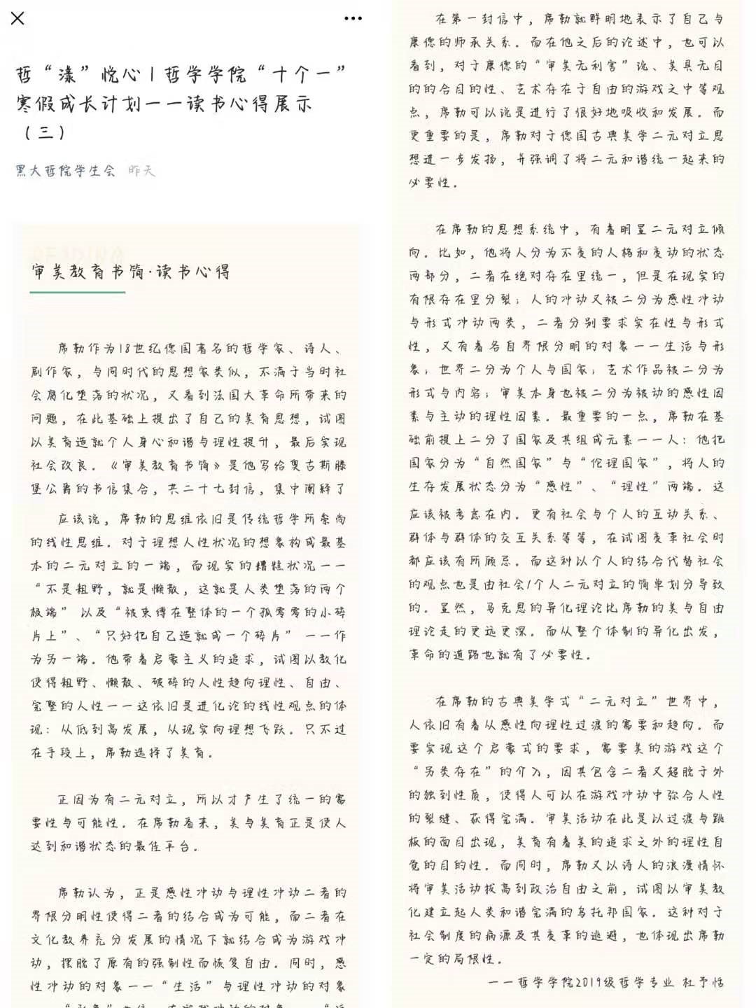 依托今日校园平台,开展了“假期期间学业规划征集活动”,促进督促学生增强学习主动性,在假期期间依然要把学习放在首位,要摆正学习心态,学会合理规划自己的学习时间,提升学习效率。结合专业特点,开设“每周一点小哲学”专栏,夯实专业知识积累,主动学习了解专业发展的动态和前景,思考现阶段面临的问题和挑战,确定阶段性目标,为下一阶段学习生活打好基础。
