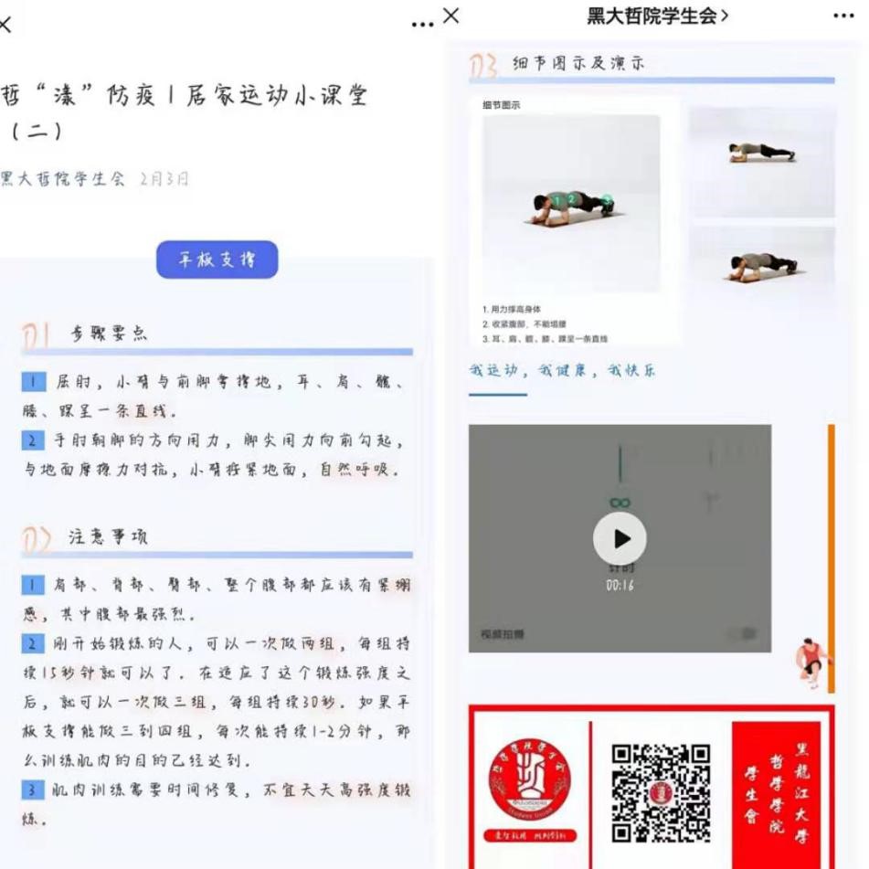 开展“居家运动小课堂”活动,开辟了“疫情防控小贴士”、“居家心理小贴士、“生活小贴士”等生活温馨提醒专栏,及时提醒学生关注自己身心健康,锻炼强壮的身体与积极向上的心态。鼓励学生利用闲暇时间开展21天居家锻炼打卡,认识到身体健康的重要意义,根据自身实际情况,合理制定运动方案,养成经常运动、规律作息的生活习惯,培养自律意识,锻炼身体素质,收获充实的生活和良好的状态,以积极向上的精神面貌和健康体质享受美好的假期生活。
