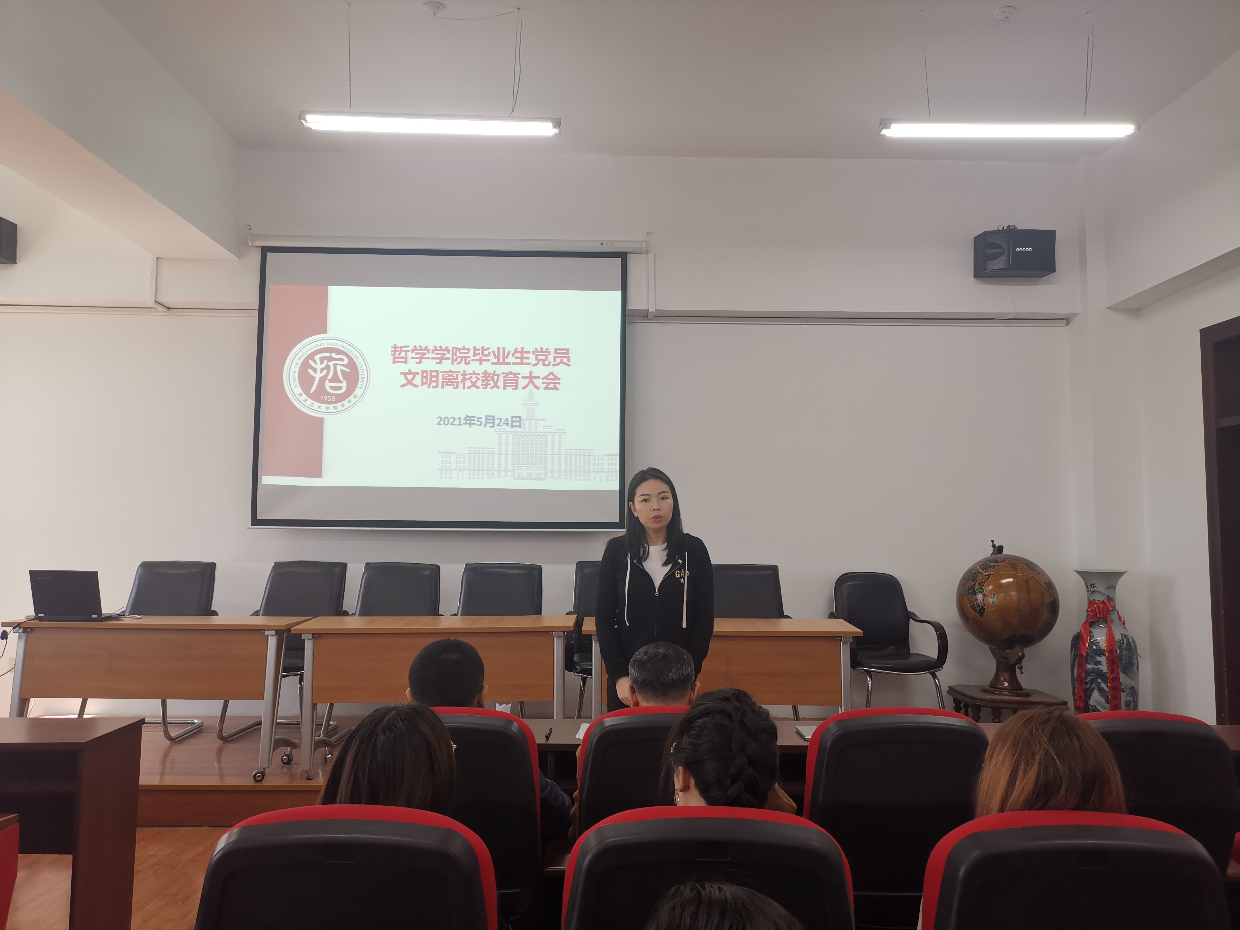 于2021年5月24日在汇文楼937室召开了毕业生党员文明离校教育大会。会议由51视频党务秘书黄影主持,51视频党总支书记孙美晖、副书记张丽丹、毕业年级辅导员孙庆斌以及全体毕业生党员参加。