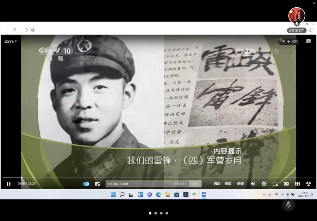 积微光可成炬,弘志愿暖人心。首先,大家观看了纪录片《我们的雷锋》,了解雷锋同志的事迹。纪录片以一张张照片,一段段谈话为媒介,介绍了雷锋的生平以及优秀的事迹。从雷锋生前的战友,到他辅导过的同学……从后人的一句句讲述中,一个鲜活而生动的雷锋形象,正一点点向大家展开。雷锋同志在他短暂的一生中,乐于助人,无私奉献,以星星之火,照亮了许多人的世界。 雷锋同志虽然已逝,但他的精神永存。在观看纪录片的过程中,雷锋的事迹与精神正跨越半个世纪的光阴,感染着同学们,雷锋精神也在大家的心中生根发芽。