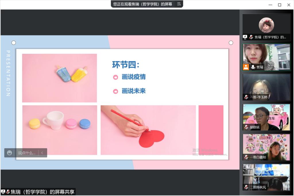 画说疫情,画说未来。焦老师带领大家以绘画的方式描述了开学及现在的心情及感想,引导同学们把心中的想法、困惑、烦恼倾吐出来,并勉励大家在疫情下认真学习,健康生活,帮助了同学们回忆过去畅想未来,进一步增强了同学们的心理素质和综合能力。