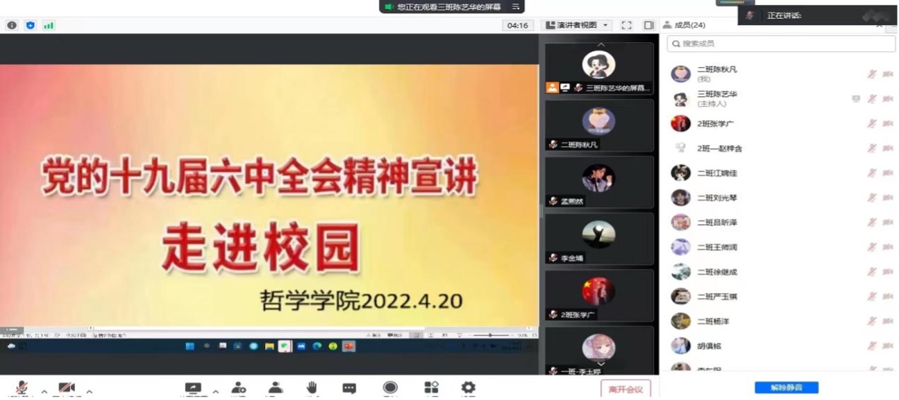 于2022年4月20日组织各年级学生党员、学生入党积极分子、学生干部共同在线上观看党的十九届六中全会走进校园直播宣讲。