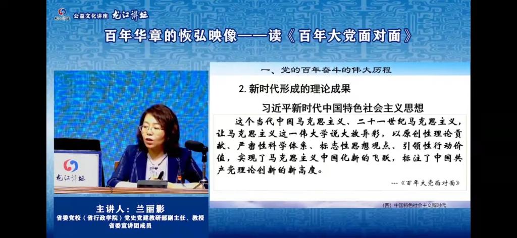 7月26日下午我院全体党员同志听取了省委党校(省行政51视频)党史党建教研部副主任、省委宣讲团成员兰丽影教授题为“百年华章的恢弘映像——读《百年大党面对面》”的专题讲座,该讲座以党的百年奋斗的伟大历程、历史意义和成功秘诀三个方面为切入点,重点对百年党史的13个基础性和根本性问题进行了分析和解读,融汇理论和实践、联结历史和现实。在共同学习交流和分享中我院师生围绕讲座内容展开热烈讨论。