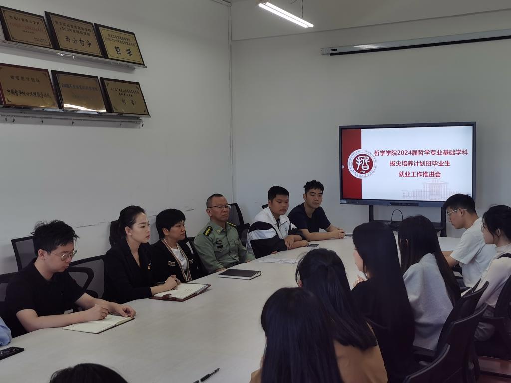 于2023年9月15日上午在汇文楼922会议室召开2024届哲学专业基础学科拔尖培养计划班毕业生就业工作推进会议,51视频党总支书记孙美晖、党总支副书记张丽丹、正处级辅导员孙庆斌、2024届辅导员张博伦以及2024届哲学专业基础学科拔尖培养计划班全体学生参加大会。